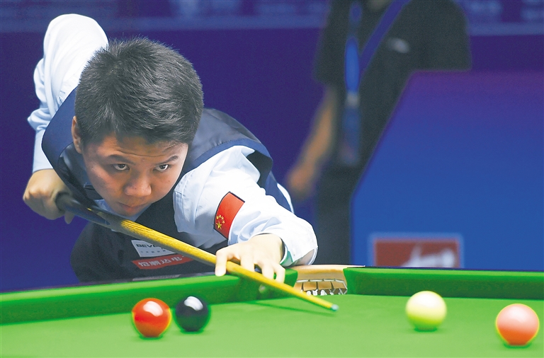 6月25日,在江苏无锡举行的2019斯诺克世界杯小组赛中,中国B队选手周跃龙/梁文博以3:2战胜马耳他队选手博格/西尼。图为周跃龙在比赛中。 新华社记者 季春鹏 摄