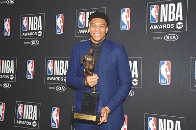 6月24日,2018-2019赛季NBA颁奖典礼在洛杉矶举行。图为密尔沃基雄鹿队球员安特托昆博获得最有价值球员奖。 新华社/路透