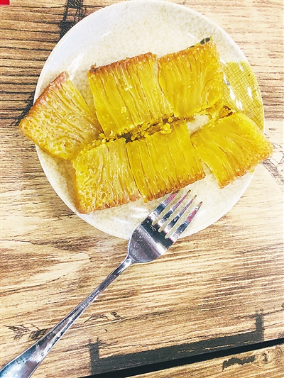 黄金糕糕如其名,成品泛着黄金般诱人的色泽,细密的小孔布满“全身”。正因如此,它也被称为千孔糕。吃一口,香甜滑爽,富有弹性,椰油的清香、牛油的醇香,撩拨味蕾,回味无穷。