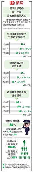 自2016年11月全省部署禁毒三年大会战以来,昌江严格按照大会战工作方案开展各项禁毒工作。由于打击有力、管控有效、宣传到位,该县戒断三年未复吸人员逐年增加,新增吸毒人员逐年减少,实有吸毒人员逐年减少,实有吸毒人员与该县人口比逐年下降;至今无在校学生吸毒案件发生;无吸毒人员肇事肇祸案事件发生。