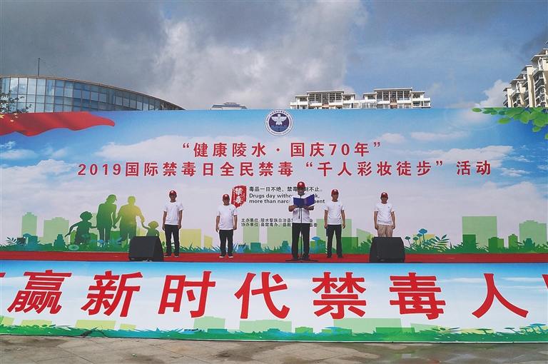 6月23日上午,以“健康陵水·国庆70年”为主题的陵水2019国际禁毒日全民禁毒彩妆徒步活动在陵水黎族自治县文化体育广场举行。陵水县委常委、县禁毒委主任、公安局长陈俊华出席并致辞。活动现场,来自该县各级机关单位、企业、学校等3000余名志愿者们身着印有“健康陵水绿色无毒”字样的文化衫,挥舞宣传小旗,共同从县文化体育广场出发,徒步3公里,以实际行动宣传全民禁毒理念。