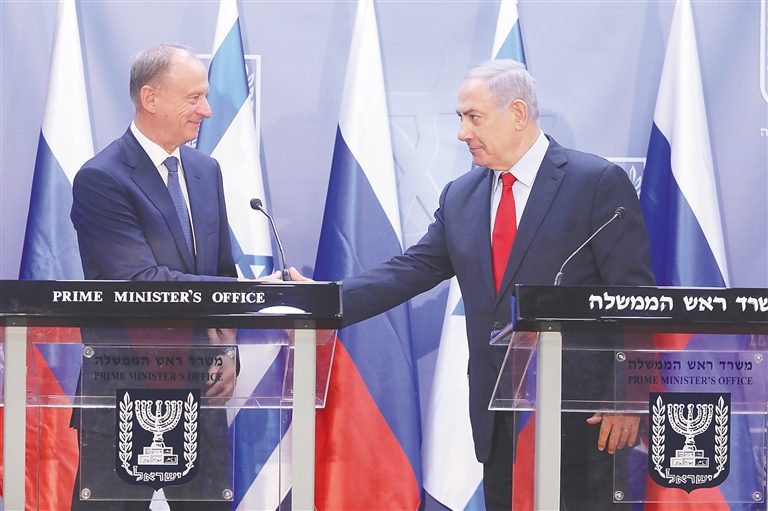 6月24日,在耶路撒冷以色列总理办公室,以色列总理内塔尼亚胡(右)和俄罗斯联邦安全会议秘书帕特鲁舍夫发表声明。