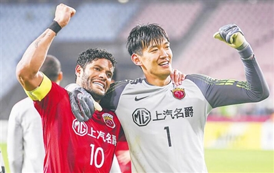 北京时间6月26日晚,在2019年亚冠1/8决赛第二回合决战中,上海上港客场与韩国全北现代战成1:1平,两回合比分2:2。在点球大战中,上港以5:3获胜,晋级八强。图为上港外援胡尔克(左)与守门员颜骏凌庆祝胜利。小新发