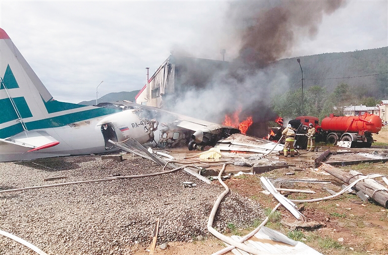6月27日,在俄罗斯布里亚特共和国境内下安加尔斯克机场事故现场,紧急救援人员给飞机灭火。 据今日俄罗斯通讯社27日报道,俄罗斯一架安-24客机当日清晨在位于俄东部的布里亚特共和国境内一机场紧急迫降,事故造成两名飞行员遇难,7人受伤。 新华社/美联