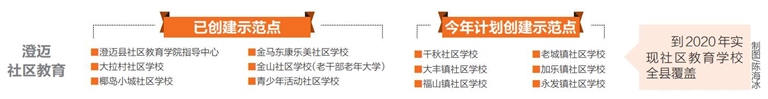 椰岛小城社区学校、金马东康乐美社区学校、金山社区学校……近年来,澄迈县委、县政府重视培育全民终身学习氛围,积极推进社区教育创建工作,已创建多所社区学校,推动中华优秀传统文化、文明健康的消费生活方式、社会主义核心价值观等渗入百姓生活,社区居民的满意度和幸福感不断提升。