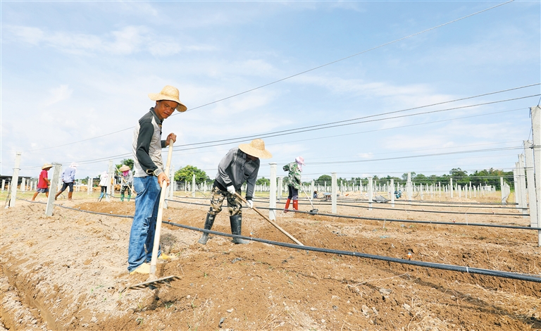 数千根支架在60亩的土地上整齐排列,细长的喷管在支架下铺展开来,10多位农民顶着灼人的阳光在地里起垄,不远处是犁地的拖拉机与成堆的有机肥。这是6月26日上午海南日报记者在陵水黎族自治县本号军普村见到的场景。