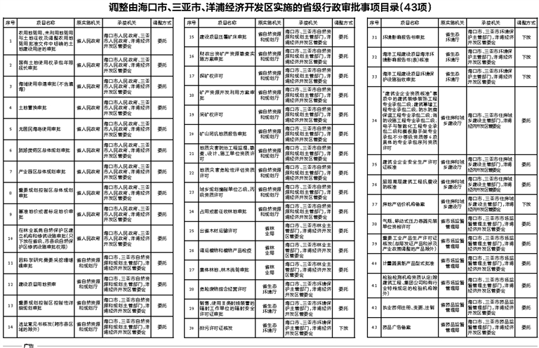为进一步推进行政审批制度改革,提高审批效率,营造法治化、国际化、便利化营商环境,加快海口市、三亚市和洋浦经济开发区建设步伐,推动海南自由贸易试验区和中国特色自由贸易港建设,根据有关法律法规规定,省人民政府决定将43项省级行政审批事项调整由海口市人民政府、三亚市人民政府及其所属部门和洋浦经济开发区管理委员会实施(目录附后)。对调整实施的行政审批事项,原实施机关应当加强业务培训指导,强化事中事后监管,做到放管结合;承接机关应当周密组织,做好各方面的部署和安排,做到规范有序。对实践证明可行的,进一步在其他市县推广实施或者提请省人大常委会通过特区立法授权实施;对实践证明不宜调整的,及时收回委托或下放事项。