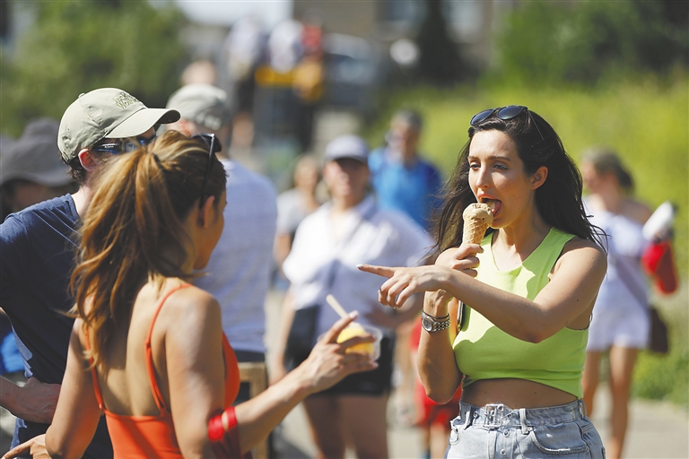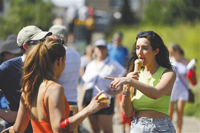 6月29日,在英国伦敦,人们在伊丽莎白女王奥林匹克公园附近吃冰激凌解暑。