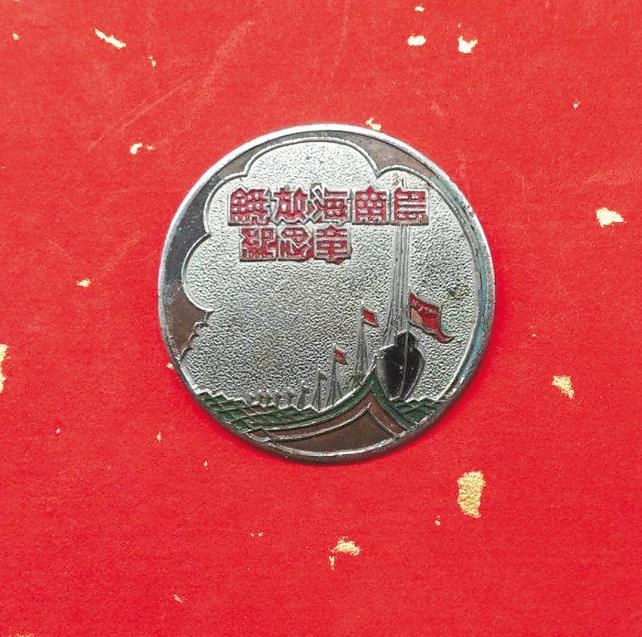 在纪念章背面有一别针,可方便地将纪念章戴在胸前;下部标注了纪念章的制作单位和颁发单位:“中南军区兼第四野战军颁发”,其中“颁发”二字另起一行。1950年初,中国人民解放军40军、43军的10万余人,组成了渡海登陆作战兵团,在当地地下武装、冯白驹指挥的琼崖纵队的有力配合下,我主力部队横渡琼州海峡,经过10多天的激战,于5月1日解放了海南全岛。
