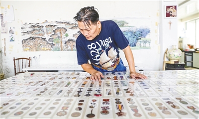 “在残酷的战争中,共产党抛头颅洒热血,这些都凝聚在一枚枚纪念章里。”从广东工艺美术学校毕业后,蔡於良被分配到海南工艺美术研究所,后调入海南出版社工作,他的业务是画画与设计,后逐渐成为海南知名画家,靠着卖画的收入开始慢慢收藏与党史相关的纪念章。蔡於良有两大间屋子专门存放这些纪念章,每一枚纪念章都被他放在一样尺寸的透明盒子里,在桌子上平铺排开,很是壮观。