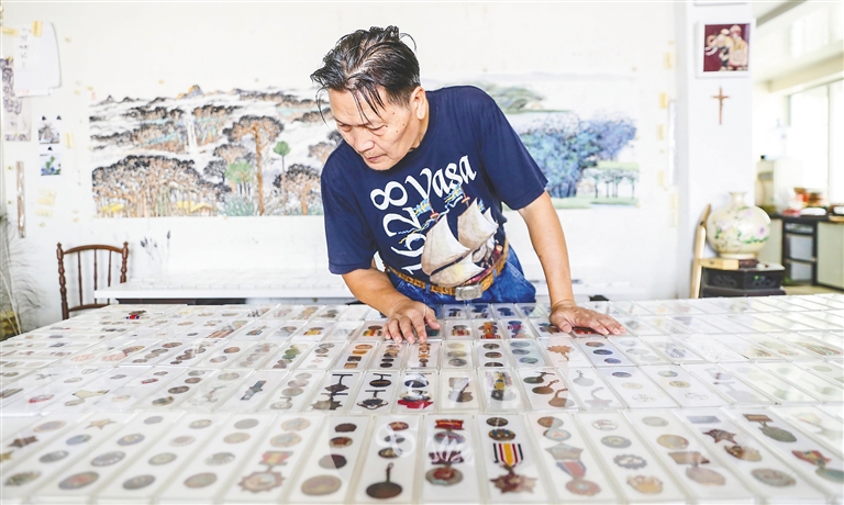 “我是摸着纪念章长大的,这些纪念章是我童年时代的回忆,看着就有亲切感。”1952年,蔡於良出生于海南澄迈,从小听着海南党史长大。