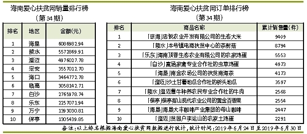 在海南爱心扶贫网第34期销量排行榜上,海南农垦以608.6万余元蝉联冠军。琼海忠锐生态大米销量继续领先,销售量累计9409件。