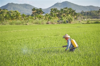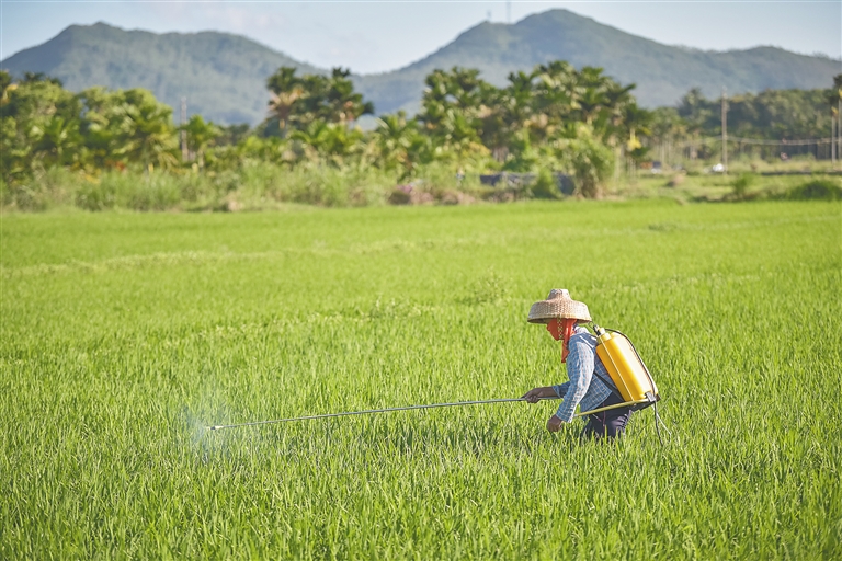 6月26日,琼海市博鳌镇北山村,农户在进行田间管理。每年夏秋两季水灾、风灾频繁,影响粮食生产,如今水稻也有了农业保险,农户种粮更有保障。