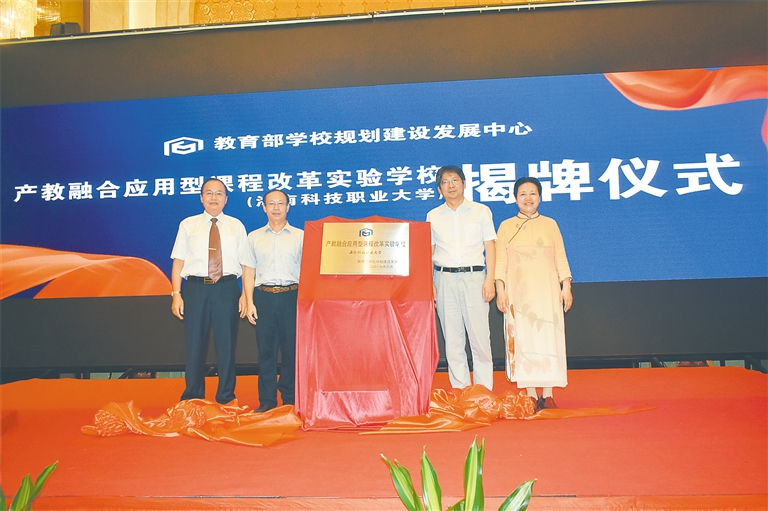 在当天报告会前,还举行了海南科技职业大学立项为教育部学校规划建设发展中心“产教融合应用型课程改革实验学校”的揭牌仪式。