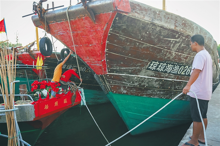 7月1日,琼海潭门,渔船回港避风,渔民忙碌着固定渔船。当天,海南省防汛防风防旱总指挥部发布相关通知,要求做好热带低压防御工作,重点做好影响海域渔船和有关船只防风避险,以及水库安全度汛、城市防洪排涝和中小河流域洪水等强降雨防范准备工作。本报记者 袁琛 摄