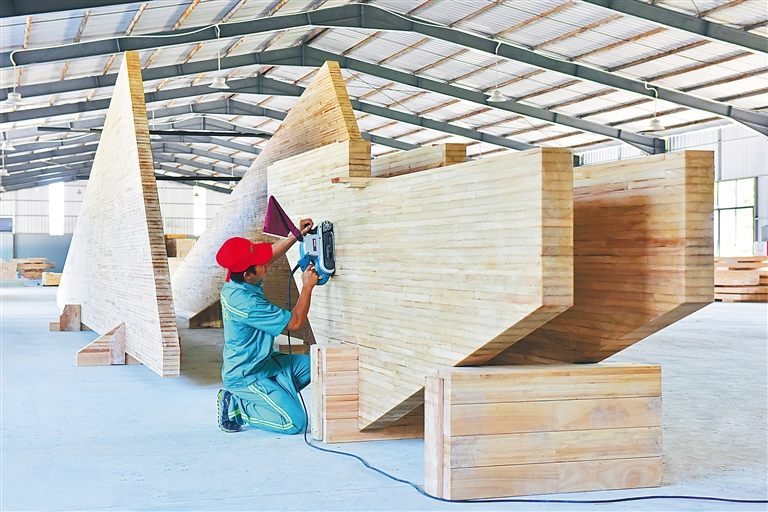 图为近日在海垦林产集团宝联加工厂内,工人正在给橡胶木胶合梁打磨,以达到木材表面平整的效果。