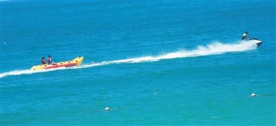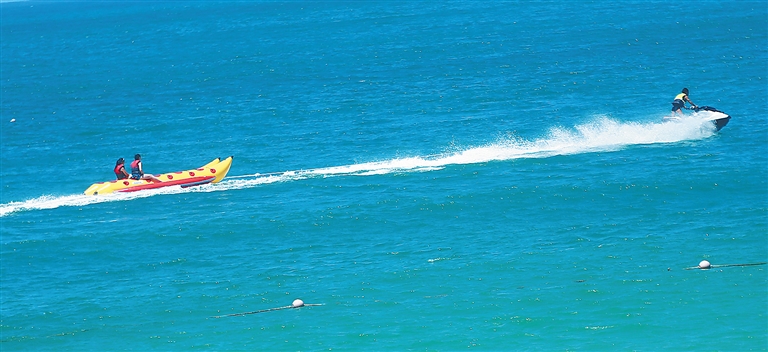 来到海边,除了游泳、踏浪等传统亲水活动外,体验刺激好玩的海上运动项目也必不可少。在西岛、蜈支洲岛等众多特色海岛或是滨海景区中,都为游客提供了丰富的海上运动体验项目,包括香蕉船、水上拖伞、水上自行车、飞鱼船、冲浪摩托艇、“海上飞龙”等,能让游客在尽享海天一色美景的同时,感受与大海亲密接触的清爽劲凉。