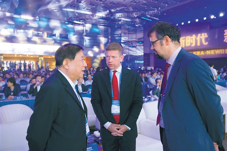 图为在2019年世界新能源汽车大会开幕前,参会的中外嘉宾在交流。