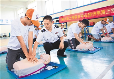 培训内容分理论和实操两部分。包括海上搜救安全技能、溺水人员抢救、常见海上伤病医疗救助等方面的现场教学和实训。图为参加培训班的琼州海峡海上搜救志愿者在练习胸外心脏按压。