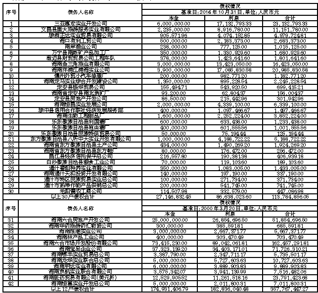 其中,三亚惠宏实业开发公司等30户债权的基准日为2016年10月31日,基准日债权本金合计27,146,832.45元,债权利息合计86,638,023.60元,债权本息合计113,784,856.05元(2016年10月31日之后产生的利息、罚息和违约金等相关权益,以及与债权相关的从权利亦在本次处置范围内);海南六合房地产开发公司等12户债权的基准日为2000年3月20日,基准日债权本金合计174,931,406.79元,债权利息合计182,836,040.48元,债权本息合计357,767,447.27元(2000年3月20日之后产生的利息、罚息和违约金等相关权益,以及与债权相关的从权利亦在本次处置范围内)。