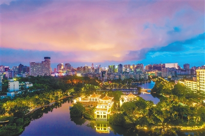 7月1日傍晚时分,高空俯瞰经过全新升级改造后的海口东湖湖心岛靓丽夜景。