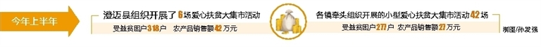线下,今年上半年,澄迈分别在老城、桥头、福山、大丰、瑞溪、金江等镇组织开展了6场爱心扶贫大集市活动,累计318户贫困户受益,实现农产品销售额42万元;由各镇牵头组织开展的小型爱心扶贫大集市活动42场,受益贫困户277户,销售农产品27万元。