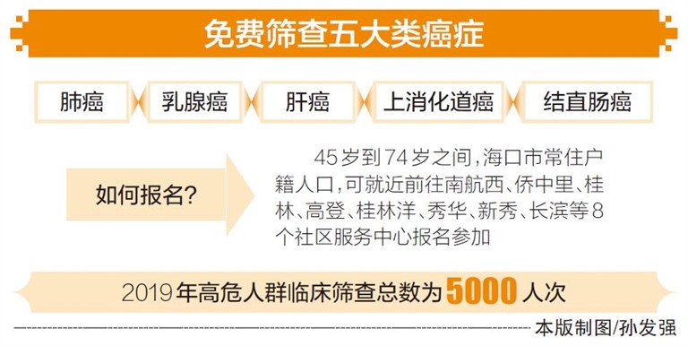 据悉,实际年龄在45岁到74岁之间,海口市常住户籍人口,均可就近前往南航西、侨中里、桂林、高登、桂林洋、秀华、新秀、长滨等8个社区服务中心填写问卷报名参加。项目工作人员将通过专项评估模型及其后台软件进行评估,确定为高危人群者可前往海南省肿瘤医院进行免费临床筛查。