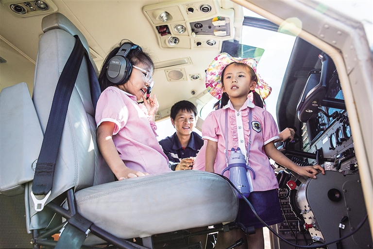 孩子们在赛斯纳208D飞机驾驶舱体验。