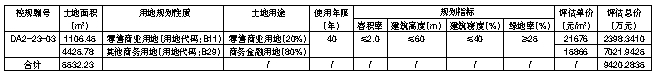 一、挂牌出让宗地基本情况和开发建设要求:(一)挂牌出让宗地基本情况:本次挂牌出让宗地位于东岸单元(迎宾路总部商务启动区)控规DA2-23-03地块,CGCS2000国家大地坐标系总面积5532.23平方米(海南平面坐标系总面积5528.96平方米),该宗地用地四至及界址坐标详见地块勘测定界图。其中,零售商业用地土地占20%,CGCS2000国家大地坐标系面积1106.45平方米(海南平面坐标系面积1105.79平方米);商务金融用地土地占80%,CGCS2000国家大地坐标系面积4425.78平方米(海南平面坐标系面积4423.17平方米)。2019年5月24日,三亚市人民政府以《关于东岸单元(三亚总部经济及中央商务启动区)控规DA2-15-04、DA2-17-01、DA2-23-03、DA2-28-01地块用地具备净地出让条件的证明》,证明控规DA2-23-03地块土地征收及“两公告一登记”工作已完成。三亚市吉阳区人民政府已与被征地单位签订了《征用土地补偿协议书》,土地补偿款、安置补助费、青苗补偿费和地上附着物等款项已支付到位,相关征地材料现存于吉阳区人民政府。目前地块上的附着物已清表、无法律经济纠纷、土地开发利用规划条件明确、符合土壤环境质量要求。地块周边可以满足施工建设所需的水、电供应,相关设备、机械可以进场施工。经核查,该宗地概况及规划指标等情况详见下表: