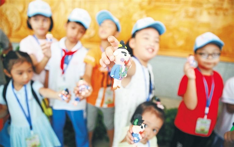 当天,在省博物馆,大家依次参观了海南历史陈列馆、海南少数民族陈列馆、非物质文化遗产陈列馆和南海海洋文明陈列馆。随后,在老师的带领下,孩子们动手用黏土创作海南省博物馆IP形象“南溟子”,在互动游戏中追寻传奇历史记忆。期间,城乡结对少儿还互相交换精心准备的爱心小礼物。