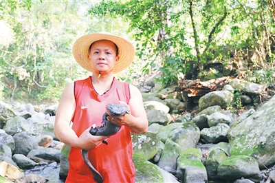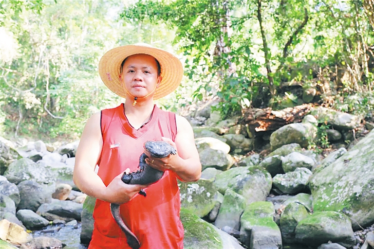 “如今,这片山涧里共养殖有近2000只娃娃鱼,不少消费者尝鲜过后都夸这鱼的口感很好。”王明确介绍,娃娃鱼是生活在淡水中的两栖动物,是大鲵属的一种,它长得像蜥蜴,外皮看似粗糙但肉质鲜嫩可口,适合清蒸、干煸、火锅等。早年,王明确在省外从事电商行业,两年前,他出差到陕西省汉中市时接触到当地已获得政府部门批准的娃娃鱼养殖项目,市场前景看好,而那时,海南白沙娃娃鱼养殖市场还是一片空白。