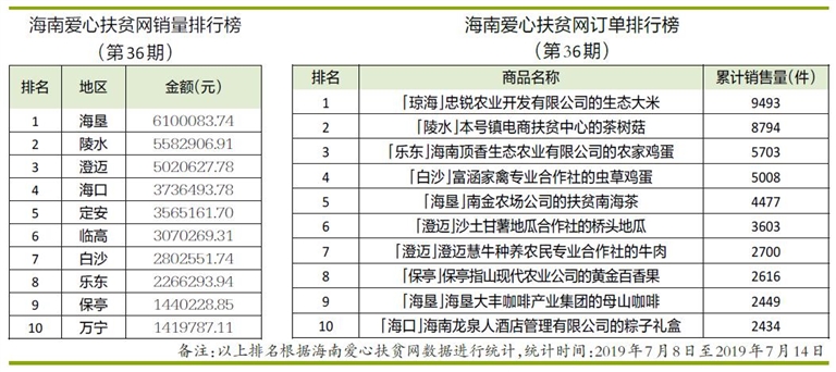 本报海口7月14日讯 (海报集团全媒体中心记者陈望 实习生陈逸航)7月14日下午,海南爱心扶贫网第36期销量排行榜和订单排行榜揭晓。海垦、陵水黎族自治县、澄迈县依然占据销量排行榜前三名的位置。订单排行榜方面,琼海忠锐生态大米、陵水本号镇茶树菇和乐东咯咯香农家鸡蛋继续领先。