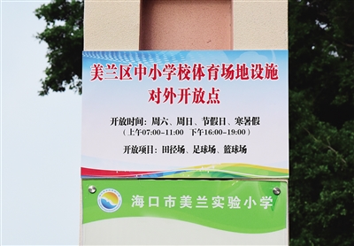 7月13日下午5时,海南日报记者来到海口市美兰实验小学,只见校门口挂着一块“美兰区中小学校体育场地设施对外开放点”的提示牌,上面标注了该校体育设施对外开放的时间和范围——“开放时间:周六、周日、节假日、寒暑假;开放项目:田径场、足球场、篮球场”。