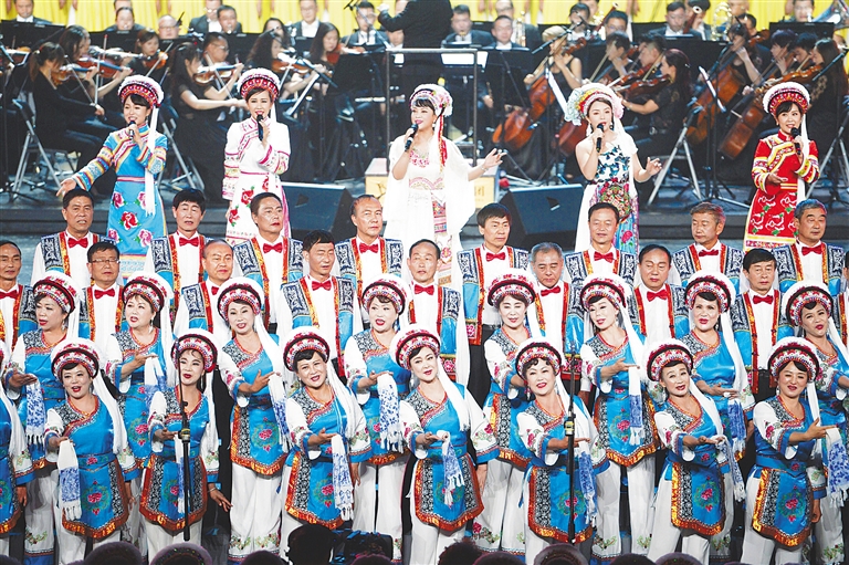 7月17日,第六届中国聂耳音乐(合唱)周在云南开幕。本届音乐周以“礼赞新中国·奋进新时代”为主题,将在昆明、玉溪两地推出一系列活动。图为演员在昆明云南大剧院举办的开幕式上表演民族合唱《苍山歌声永不落》。 新华社发