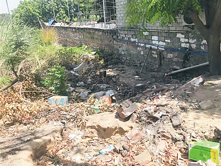 G225国道两旁,入学村不少村民在这里经营饭店、小卖店等生意。不过,在赚钱的同时,村民们也未能做好“自家一亩三分地”的环境卫生。记者看到,在一家饭店与商铺交界地带,虽然摆放了一个垃圾桶,但垃圾桶内空空如也,反倒是几米远的墙角处堆放了不少破旧泡沫箱、纸皮、椰子壳等垃圾。