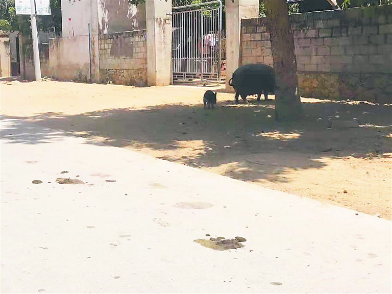 往村里继续走,几头散养的母猪带着幼崽到处晃悠,其中一头母猪还在一村民家院外撒尿。