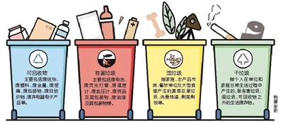 生活垃圾收集容器分类设置。居民区、办公区、文教区和宾馆酒店应当分类设置有害垃圾、湿垃圾、干垃圾、可回收物的收集容器。从事餐饮服务、集体供餐等活动的场所以及农贸市场、农产品批发市场应当设置湿垃圾专门容器;除农贸市场、农产品批发市场可以设置敞开式容器外,其他从事餐饮服务、集体供餐等活动的场所原则上应当采用密闭容器存放。公共场所、商业楼宇等区域应当根据可回收物的产生数量,设置可回收物容器或者临时存储空间,实现单独分类、定点投放,必要时可以设专人分拣打包。