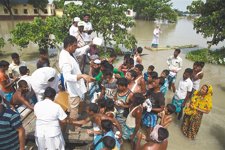 7月19日,在印度阿萨姆邦,医务人员向受灾居民发放药品。