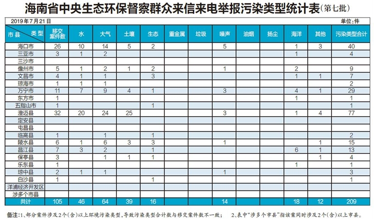 海南省中央生态环保督察群众来信来电举报污染类型统计表(第七批)