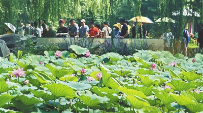7月21日,游人在圆明园遗址公园观赏荷花。炎炎夏日,北京圆明园遗址公园吸引众多市民和游客前来观赏荷花。 新华社记者 李欣 摄
