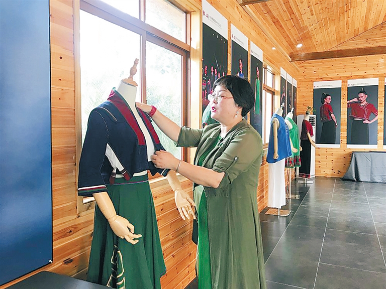 “黎族美孚方言区的服饰颜色以黑色、深蓝色相间为主,装饰图案精致。我在制作这套服饰时保留了这些元素,又对衣服的袖口、领子进行了创新。”指着一件立领对襟的上衣,杨洋对海南日报记者说。