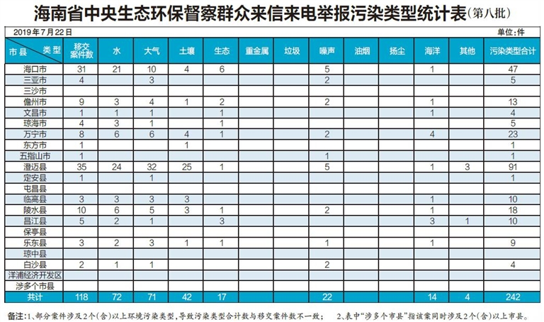 海南省中央生态环保督察群众来信来电举报污染类型统计表(第八批)