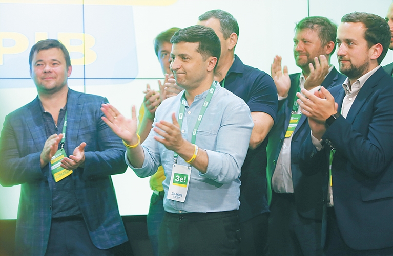 7月21日,在乌克兰首都基辅的人民公仆党议会竞选总部,乌总统泽连斯基(前排左二)鼓掌祝贺自己所在的人民公仆党进入新一届乌克兰议会。