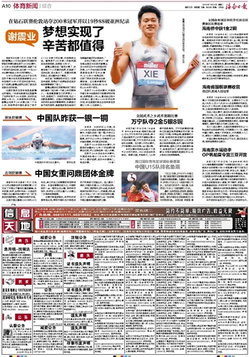 海南日报 体育新闻综合 010 2019-07-231 2019年07月23日 星期二