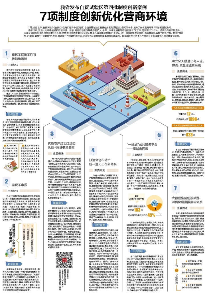 去年以来,我省大力改善投资和市场环境。目前,海南市场主体规模不断扩大,今年上半年全省新增市场主体8.74万户,同比增长31.5%。经济外向度不断提升,上半年全省实际利用外资同比增长3.6倍;货物进出口总值增长45.6%;接待入境过夜游客增长19.3%。这一串串数据充分表明,海南营商环境有了明显改善。按照“首创性、已实施、效果好、可复制”的原则,并经第三方权威机构评估,此次发布7项营商环境类制度创新案例。我省相关部门负责人在发布会上就媒体关心的问题作了回答。