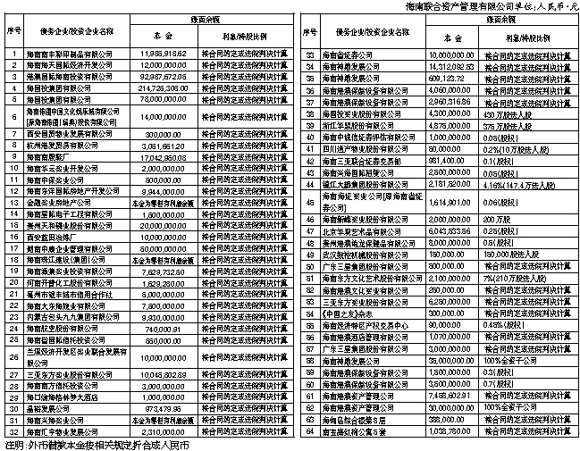 根据协议,海南联合资产管理有限公司(原海南联合资产管理公司,下同)已从相关金融机构受让了下列债权、股权投资权益、其他类资产及其相关权益(清单所列本金计算基准日为2019年7月22日。应付利息按合同约定或法院判决另行计算)。海南联合资产管理有限公司作为下列债权、股权投资权益、其他类资产及其相关权益的受让人,现公告要求债务人、担保人及其他义务人立即向海南联合资产管理有限公司履行相应合同约定或法院判决所确定的义务(若债务人、担保人及其他义务人因各种原因更名、改制、歇业、吊销营业执照或者丧失民事主体资格,请相关承债主体、清算主体代为履行义务或者承担清算责任)。联系电话:0898-68582219;联系地址:海南省海口市滨海大道81号南洋大厦23楼。