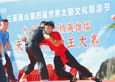7月27日,三亚南山第四届世界太极文化旅游节“太极志——太极英雄擂”推手比赛之“天涯海角擂主大赛”,在三亚天涯海角游览区开赛,来自全国各地的太极推手高手,将进行为期2天的角逐。本次比赛邀请了国内多个战队参赛,其中多位参赛选手曾在全国的诸多武术、太极拳比赛中获得过推手冠军。