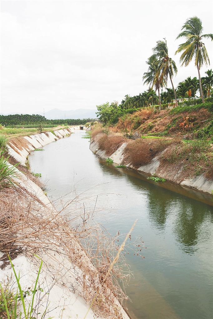 时值盛夏,三亚市崖州区马丹村外,田野平坦广袤,夏禾初长,正是亟需水源灌溉之时。绿野中,一处溪流平静流淌,连接着两岸无数稻田间的细小支流;更远处,马丹村大隆西干渠似笔直的廊桥,高高横亘在稻田之上,从望不见头的地方引来一脉清流。古今的对比在这里悄然并存。