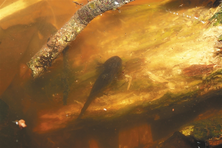 一段时间后的再度到访,米红旭看到海南疣螈的半透明圆形卵泡已遍布水潭四周。孵化到一半的胚胎缩在卵泡里,不停地翻着跟头,几乎一刻也消停不下来。