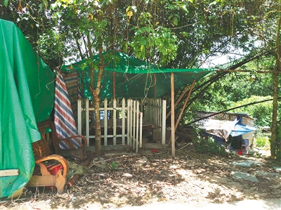 离此处不远的一片树荫底下,同样搭建有一处棚屋。海南日报记者注意到,几根木棍撑起一块绿色篷布,底下的白色栅栏围成一圈,中间用木板和石砖搭成一张简易长桌。棚屋前,另一块绿色篷布将杂物盖住,底下放置着一张坏的木质沙发,塑料桶、编织袋堆放四周,显得凌乱不堪。